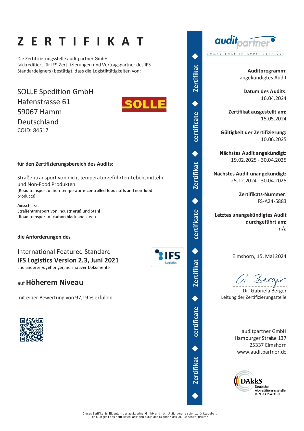 Die Solle Spedition GmbH hat erfolgreich die IFS Logistics-Zertifizierung auf Höherem Niveau bestanden. Damit wird die Einhaltung hoher Standards im Straßentransport von Lebensmitteln und Non-Food-Produkten bestätigt.
