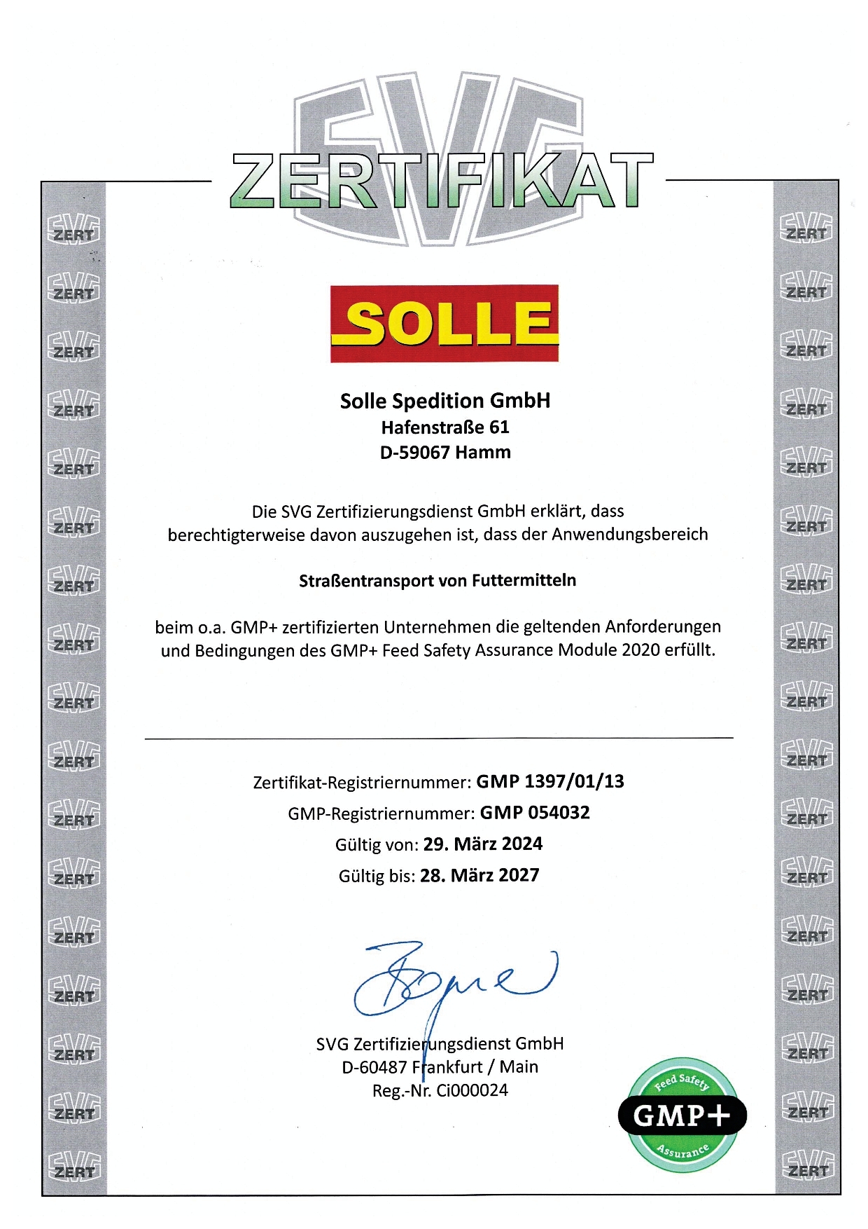 Die Solle Spedition GmbH hat erfolgreich die GMP+ Zertifizierung erneuert. Damit wird bestätigt, dass die Anforderungen im Straßentransport von Futtermitteln eingehalten werden, um höchste Sicherheit und Qualität zu gewährleisten.