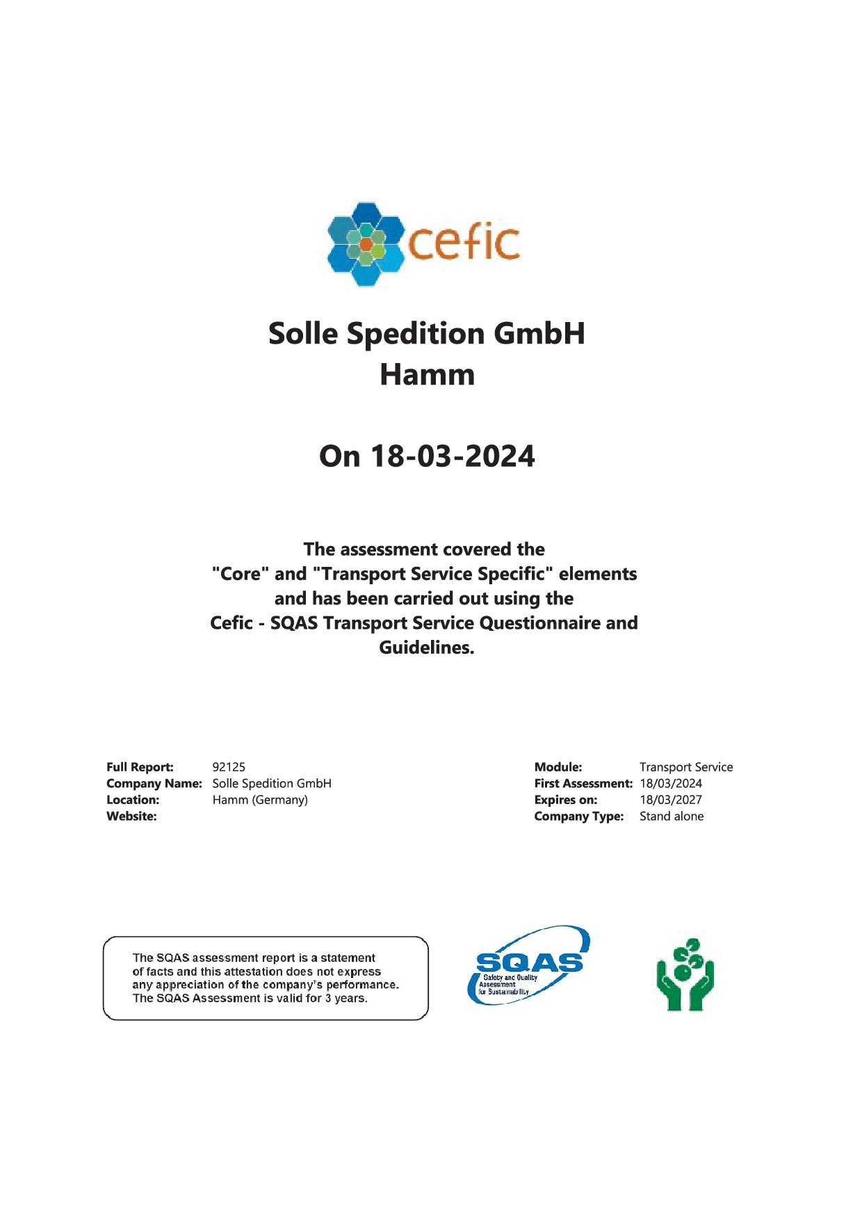 Die Solle Spedition GmbH hat erneut erfolgreich das SQAS Assessment durchgeführt. Die SQAS-Prüfung rückt die Aspekte Sicherheit und Umweltverträglichkeit bei Lagerung und Transport von Chemikalien in den Mittelpunkt.